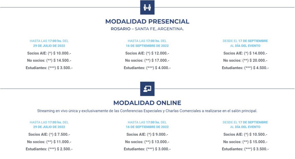 Las tarifas tendrán un primer descuento promocional hasta el 29/07/2022. Desde esta fecha, el segundo valor promocional será hasta el 16/09/2022. Finalmente, con el valor regular se podrá realizar la inscripción hasta el mismo día del evento.