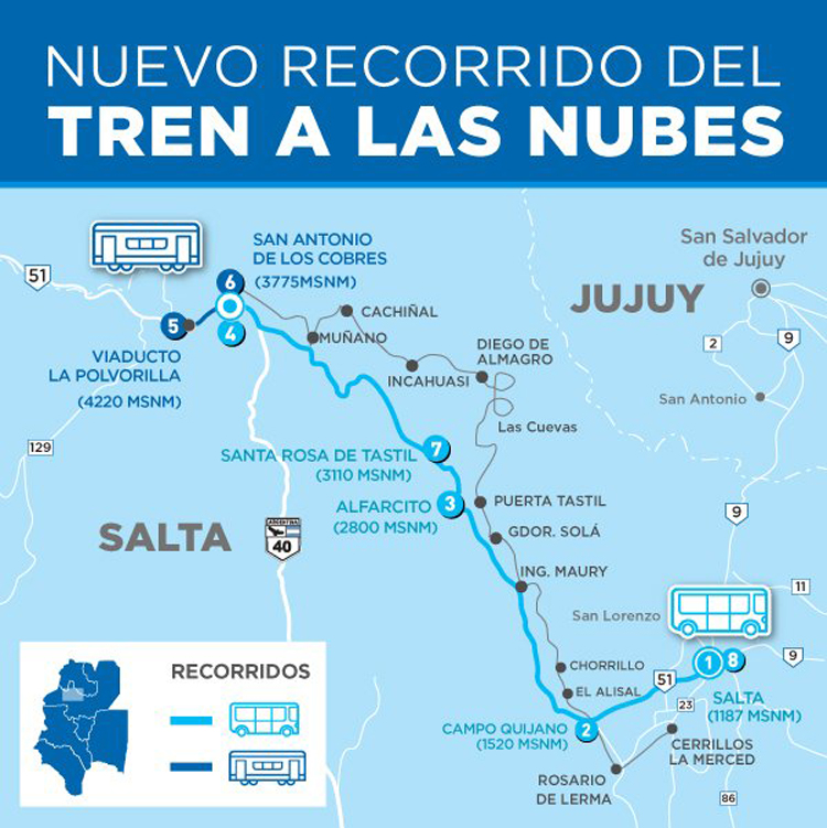 Desde 2015, el Tren a las Nubes incluye salida en autobús desde la ciudad de Salta, recorriendo por la RN 51 las localidades de Campo Quijano y Gobernador Solá hasta llegar al paraje El Alfarcito. Luego el viaje continúa por la Quebrada de las Cuevas y después la llanura de Muñano para llegar a San Antonio de los Cobres.